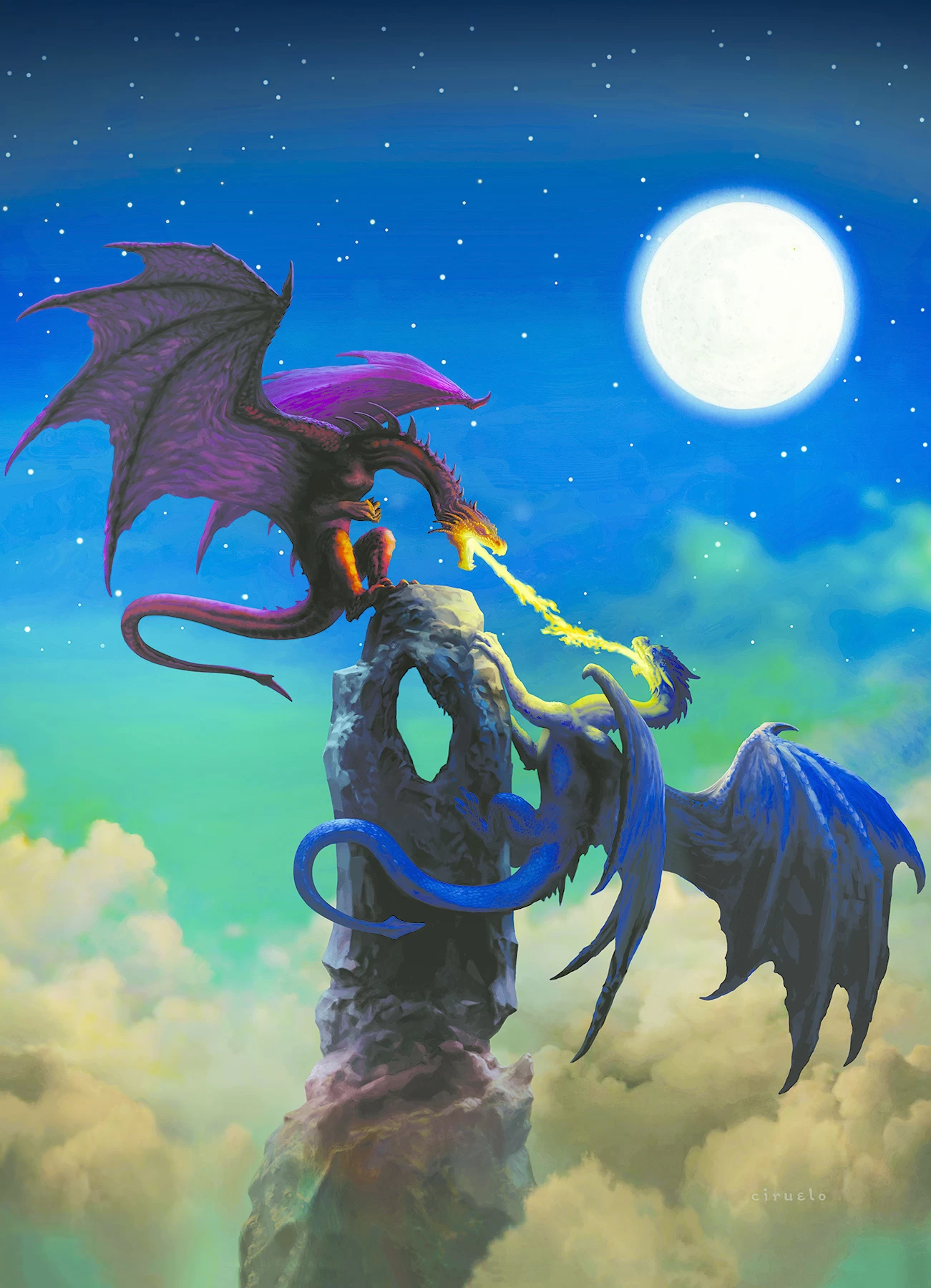 In het maanlicht staan de rode en blauwe draak lijnrecht tegenover elkaar in hun vuurzwaardgevecht. Wie zal er als winnaar uit de strijd komen? Deze sprookjesachtige puzzel heeft maar liefst 1000 stukjes, ga jij het avontuur aan?