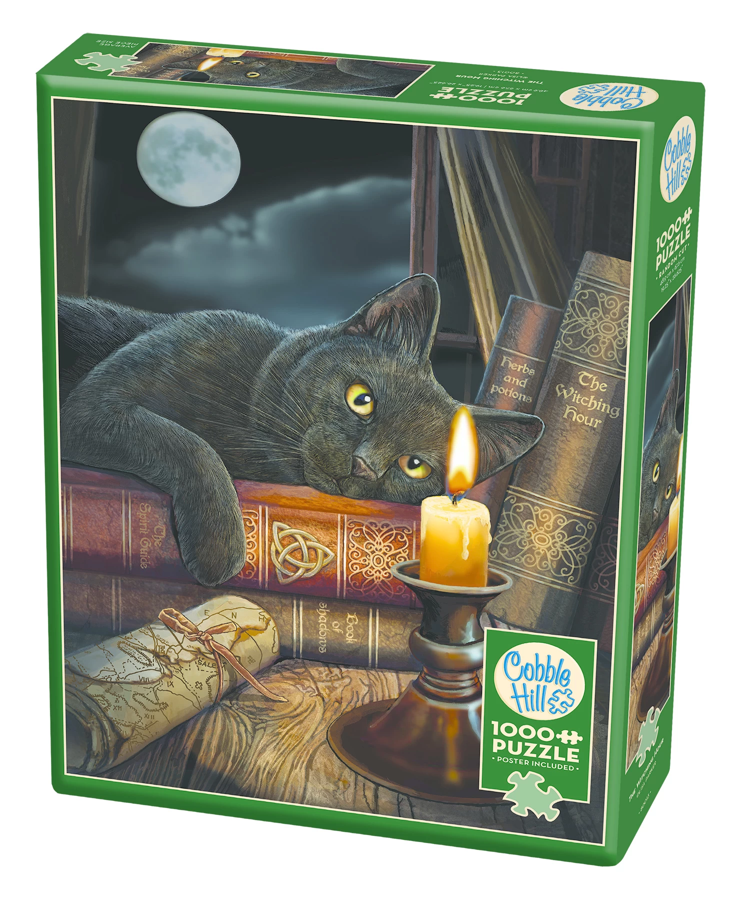 In het licht van de middernachtkaars wacht de zwarte kat stilletjes op ‘The witching hour’. Een angstaanjagende puzzel van maar liefst 1000 stukjes, wie durft hem te maken?