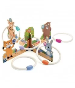Leuk vaardigheidsspel van het Deense merk Dantoy. Kan je goed mikken? dan scoor je de meeste punten en win je het spel. Probeer de ringen om de paaltjes te gooien en zo punten te scoren. Elke paaltje is een ander aantal punten waard. Om het iets moeilijker te maken kun je telkens een stapje verder naar achteren zetten.