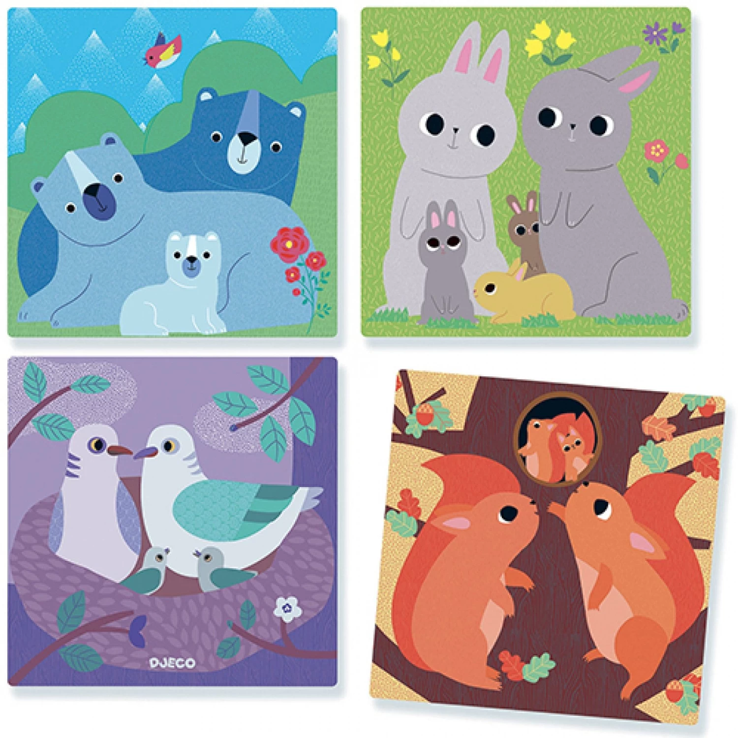 De 8 blokken vormen samen 4 puzzels met vrolijke afbeeldingen van verschillende bosdieren. Gebruik je de vier voorbeeldkaarten om de puzzels te maken of probeer je het zelf?