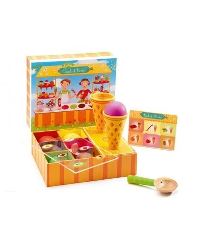 Deze prachtige ijssalon van Djeco bestaat uit 8 houten bolletjes ijs, een houten lepel en twee vilten ijshoorntjes. De mooie stevige doos is meteen de ijssalon en heeft een klein menukaartje en twee gaatjes om de ijsjes voor de klanten in neer te zetten.
