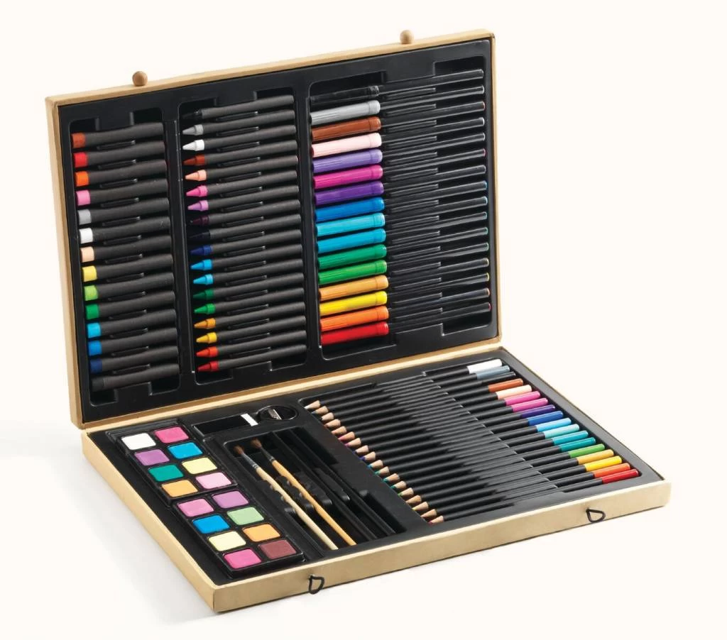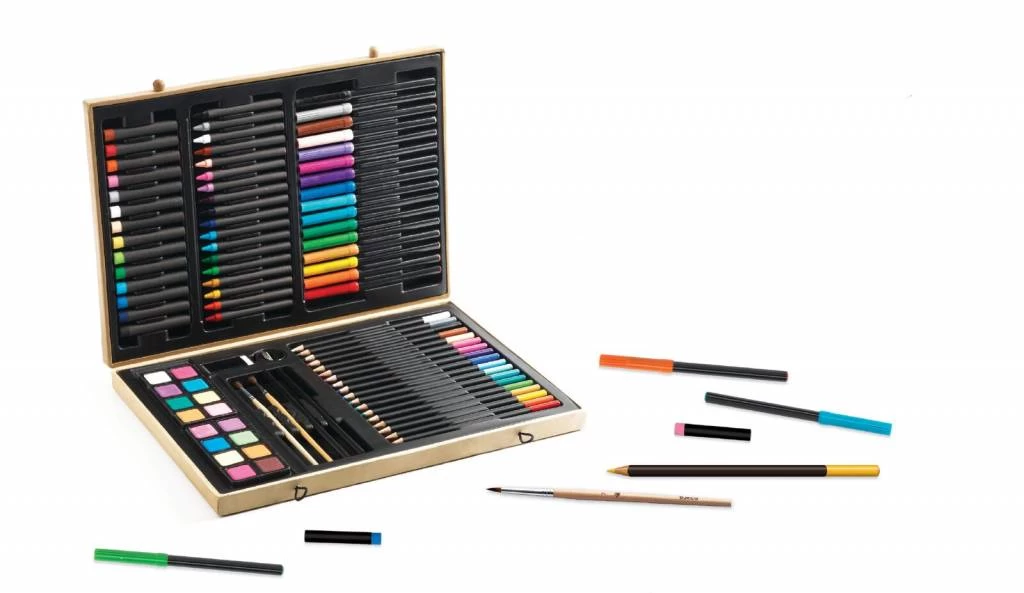 Deze prachtige grote tekendoos van Djeco bestaat uit maar liefst 18 kleurpotloden, 18 wascokrijtjes, 16 viltstiften, 14 pastelkrijtjes, 16 blokjes waterverf, 2 kwastjes, 2 tekenpotloden, een puntenslijper en een gum.