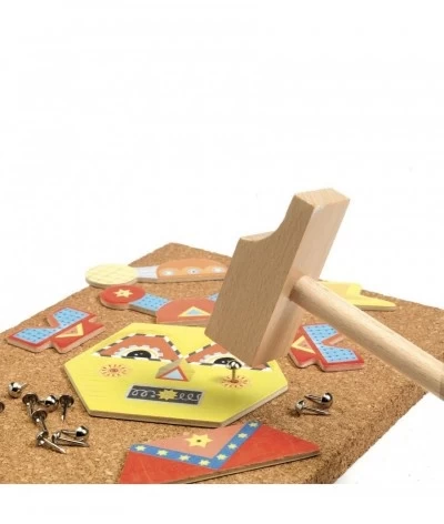 - Inhoud: 1 hamer, 1 kurkplank, 5 dubbelzijdige kaarten voor 10 modellen, 28 houten stukken, 40 nagels
