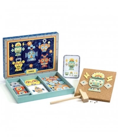 Met dit prachtige hamertje tik spel worden de meest prachtige stoere robots gebouwd. Door de vele mogelijkheden zullen kinderen hier urenlang zoet mee spelen. Het spel bestaat 28 houten stukken die op een dik kurkbord getikt moeten worden. Met de 5 voorbeeldkaarten kunnen verschillende robots gemaakt worden, maar nog leuker is het om je eigen fantasie te gebruiken!
