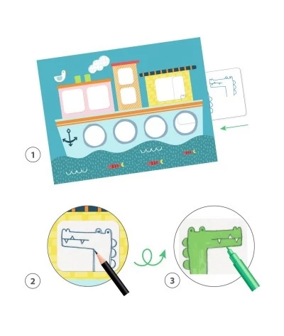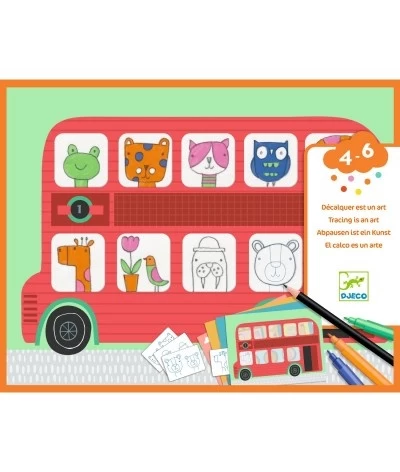 - Inhoud: 12 dubbellaags geïllustreerde vellen van 28×21 cm, 15 overtrekkaarten van 10×7, potlood met gum, 4 viltstiften en een instructieboekje.