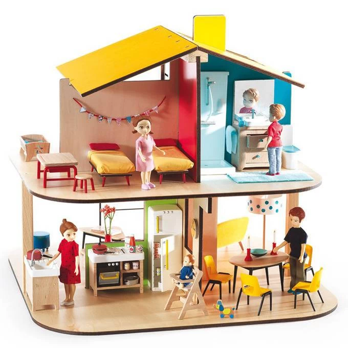 Dit moderne poppenhuis van het Franse merk Djeco is echt een plaatje! Het houten huis heeft diverse kamers die allen zijn geschilderd in verschillende frisse moderne kleuren.