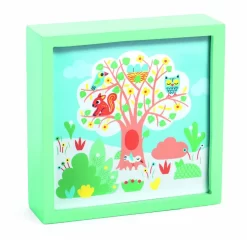 Als het donker wordt veranderd dit mooie schilderijtje in een magisch nachtlampje. In het donker zie je pas wie zich verstopt heeft achter dat bosje….en waar is het schildpadje nou?