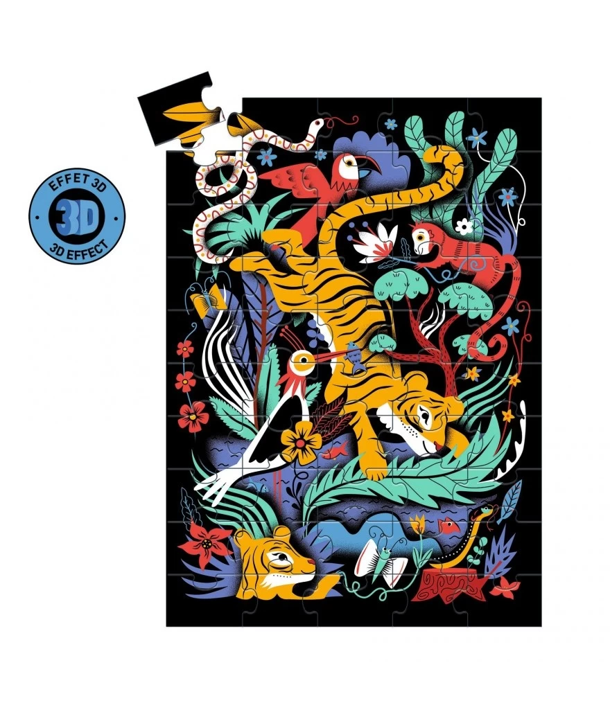 Wederom een unieke puzzel van Djeco! De puzzel ‘The Tiger Leap’ met 50 stukjes is namelijk geen gewone puzzel, het is een echte 3D puzzel! Puzzel hem gauw in elkaar, zet de 3D bril op en je ziet de tijgers in 3D!