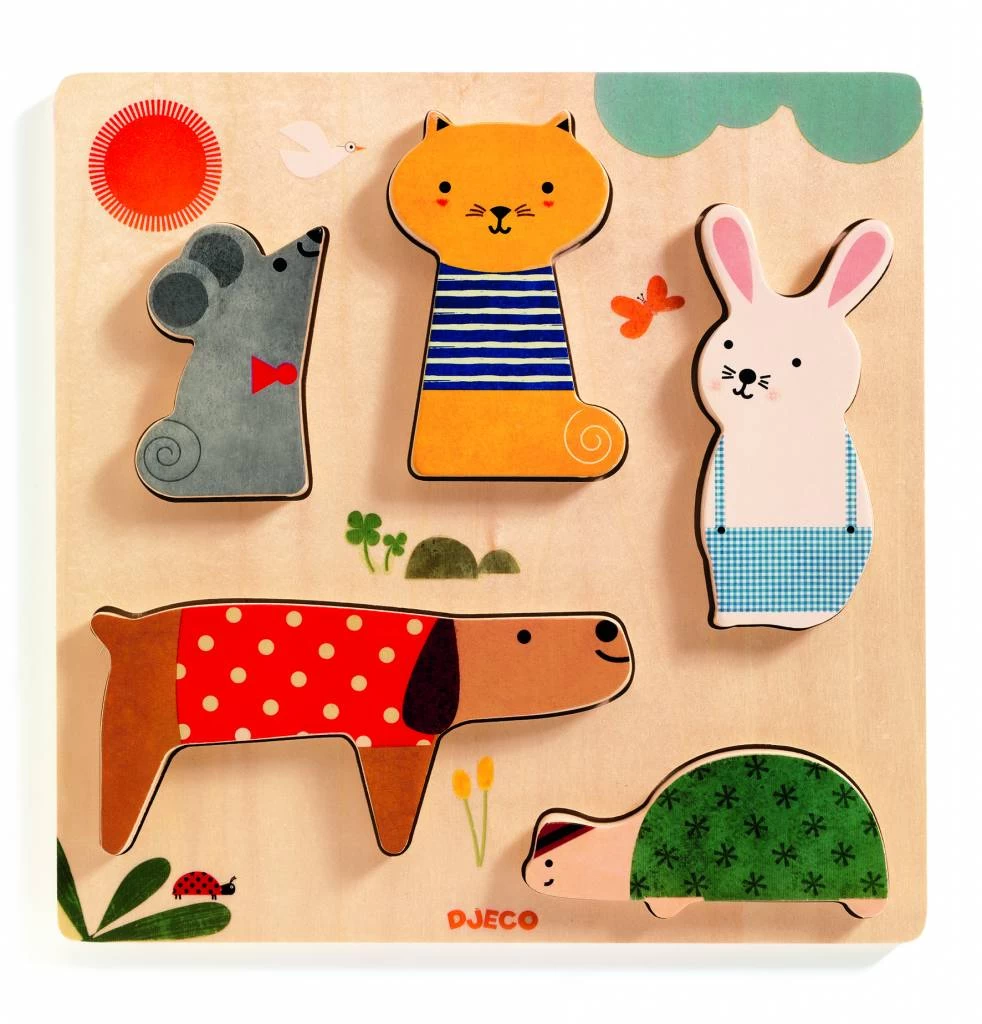 Een leuke houten puzzel Woodypets van het merk Djeco voor de allerkleinsten. Deze reliefpuzzel heeft 5 dikke puzzelstukjes van huisdieren in zachte kleuren. De stukjes zijn voor de kleintjes makkelijk vast te houden en te plaatsen. Naast het puzzelen met de dieren is het ook leuk om los met ze te spelen.