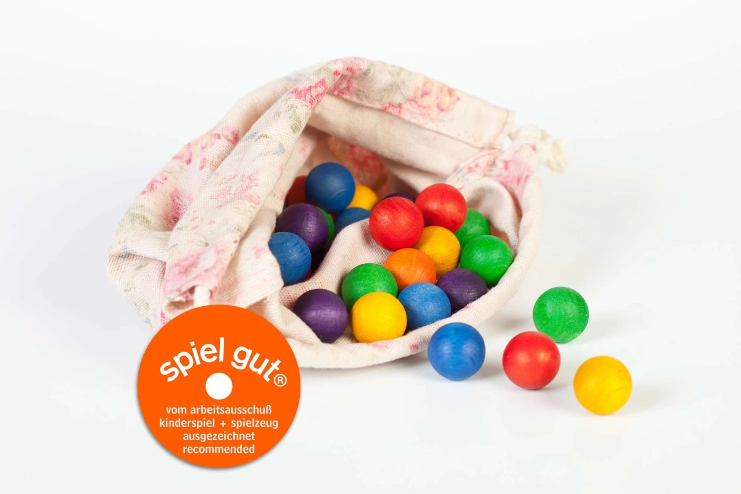 Set van 36 mooie houten knikkers in 6 verschillende regenboogkleuren. De knikkers van het mooie Spaanse merk Grapat kun je uiteraard gebruiken om mee te knikkeren, maar ook sorteren, tellen of gewoon rollen. Je mag het zelf weten.