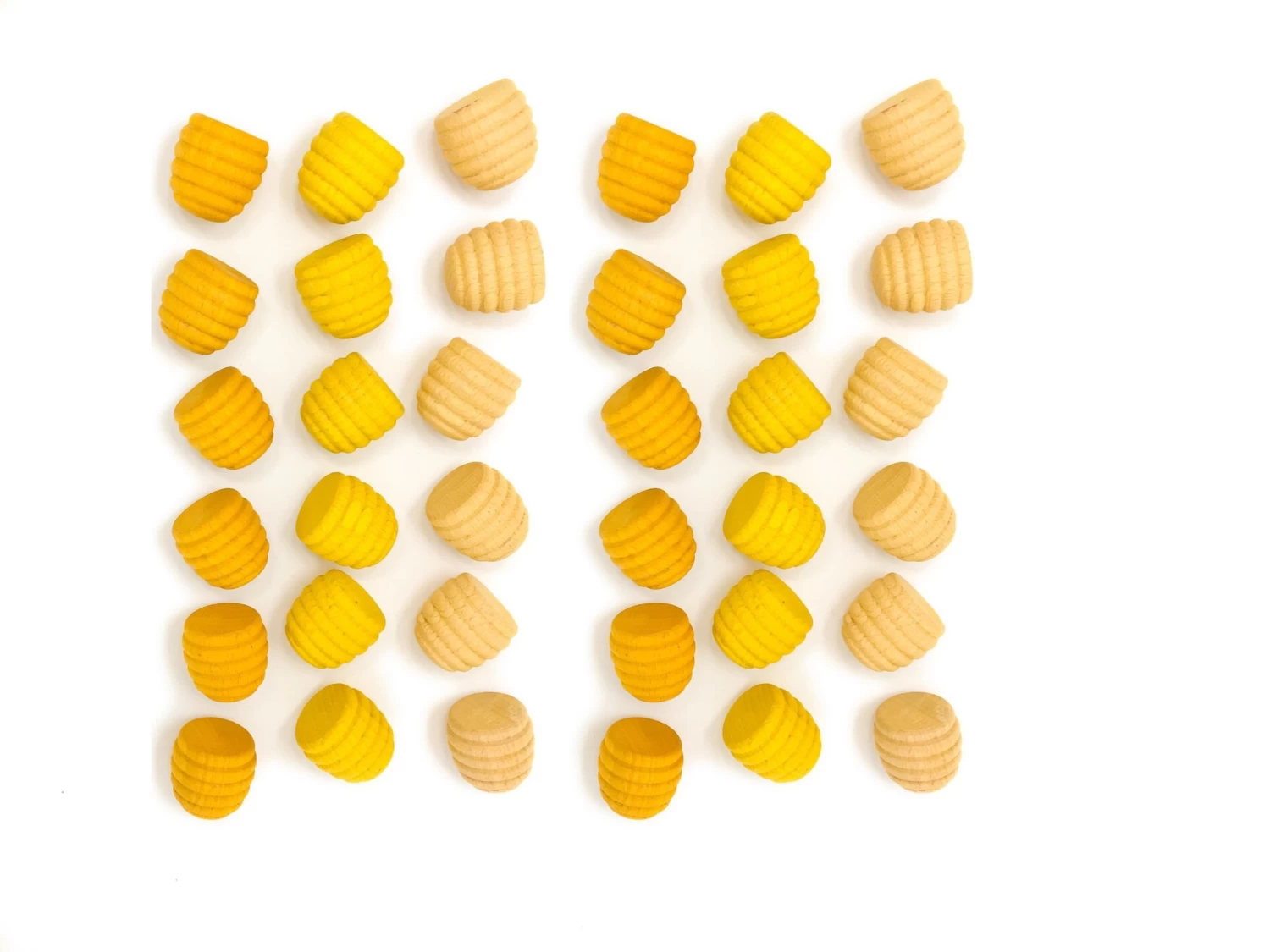 Houten mandala set van 36 kleine honinggraten geschilderd in 3 tinten geel. Gebruik andere mandala sets van Grapat om mooie vormen en patronen te creëren. Gebruik ze om te sorteren, tellen, stapelen of als onderdeel van de seizoen tafel.