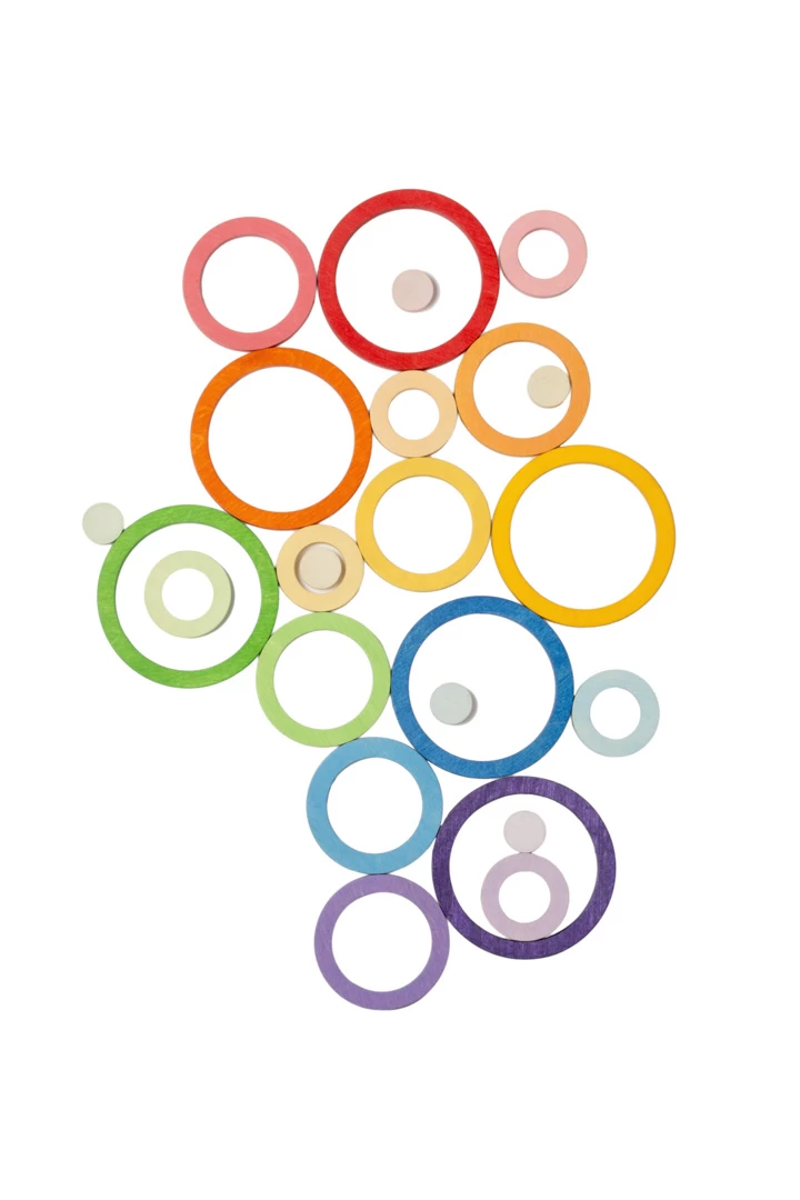 Kleurrijke set van 24 houten ringen in prachtige regenboogkleuren. Deze set van het Spaanse merk Grapat heeft eindeloos veel spelmogelijkheden; sorteren, structureren, bouwen, patronen maken of rollen over de vloer.