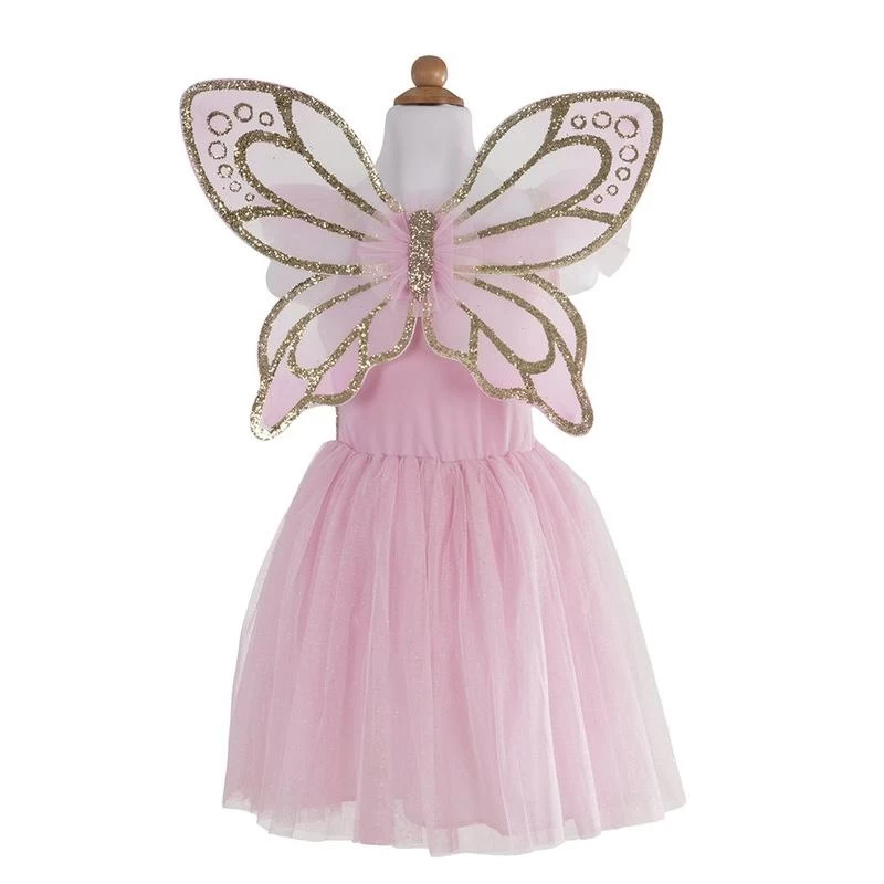 Deze adembenemende gouden vlinderjurk van Great Pretenders is zowel modieus als sprookjesachtig. Je dochter zal stralen als een vlinders op een mooie zomerdag. De jurk heeft een verbazingwekkende gouden pailletten top met tule mouwaccenten. De top loopt over in een rok van zachtroze tule met gouden vlindertjes. In combinatie met de glinsterende goud gestikte glitter vleugels is deze jurk een groot succes.