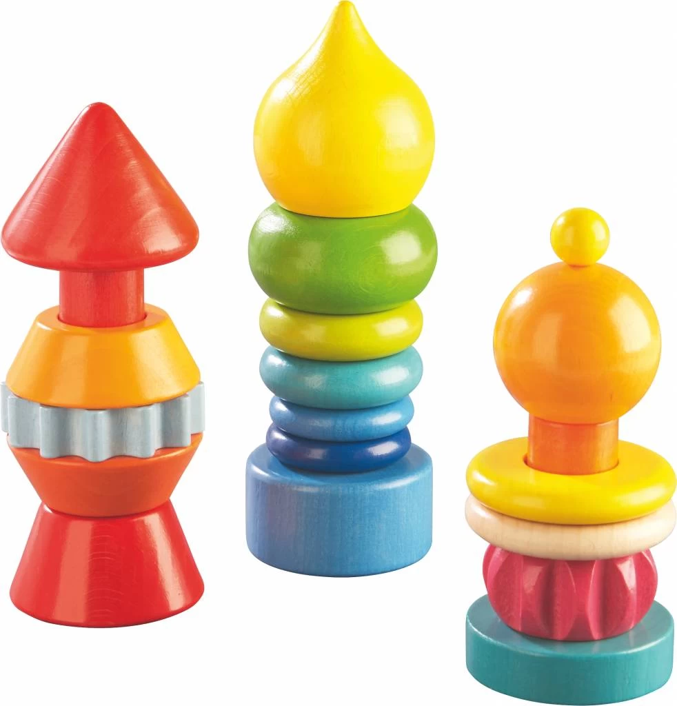 Kleine bouwmeesters kunnen de kleurrijke houten stukken naar believen samenvoegen tot drie torens of er één heel hoge toren mee bouwen. Welke spits moet op de grote toren? Dat is altijd opnieuw heel leuk en bevordert de fijne motoriek.