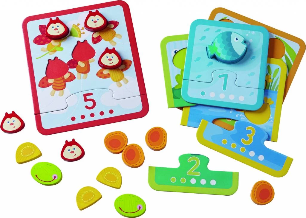 1, 2, 3 of 4, hoeveel slakken zie je hier? De kinderen ordenen de houten plankjes en leren zo de hoeveelheden van 1 tot 5 kennen en onderscheiden. Daarna wordt het onderste stuk van het legplankje eraan gepuzzeld. Hierop staan voor de kinderen het bijpassende getal en de hoeveelheid stippen aangegeven.