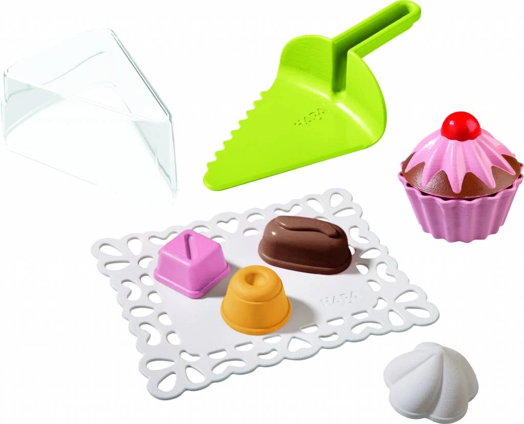 Inhoud: 1 taartschep, 1 taartvormpje, 3 bonbonvormpjes, 1 slagroomvormpje, 1 muffinvormpje, 1 gebakschaal