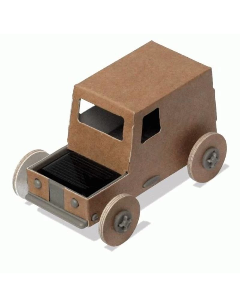 - Inhoud: In de stoere verpakking vind je een voorgestanst kartonnen vel, bevestiging voor de wielen en Powerbase, dat bestaat uit een zonnepaneeltje (polycrystal) met oplaadbare accu en een elektrische motor met een ‘versnellingsbak’.