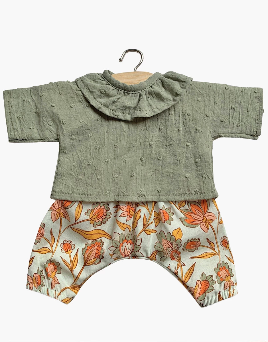 Dit zomers poppensetje is van het Franse merk Minikane. Het shirtje en broekje zijn gemaakt van zacht katoen en geschikt voor de Paola Reina en Minikane poppen met een lengte van 34 cm. Het setje heeft mooie aardetinten en het broekje heeft een zomerse planten print.