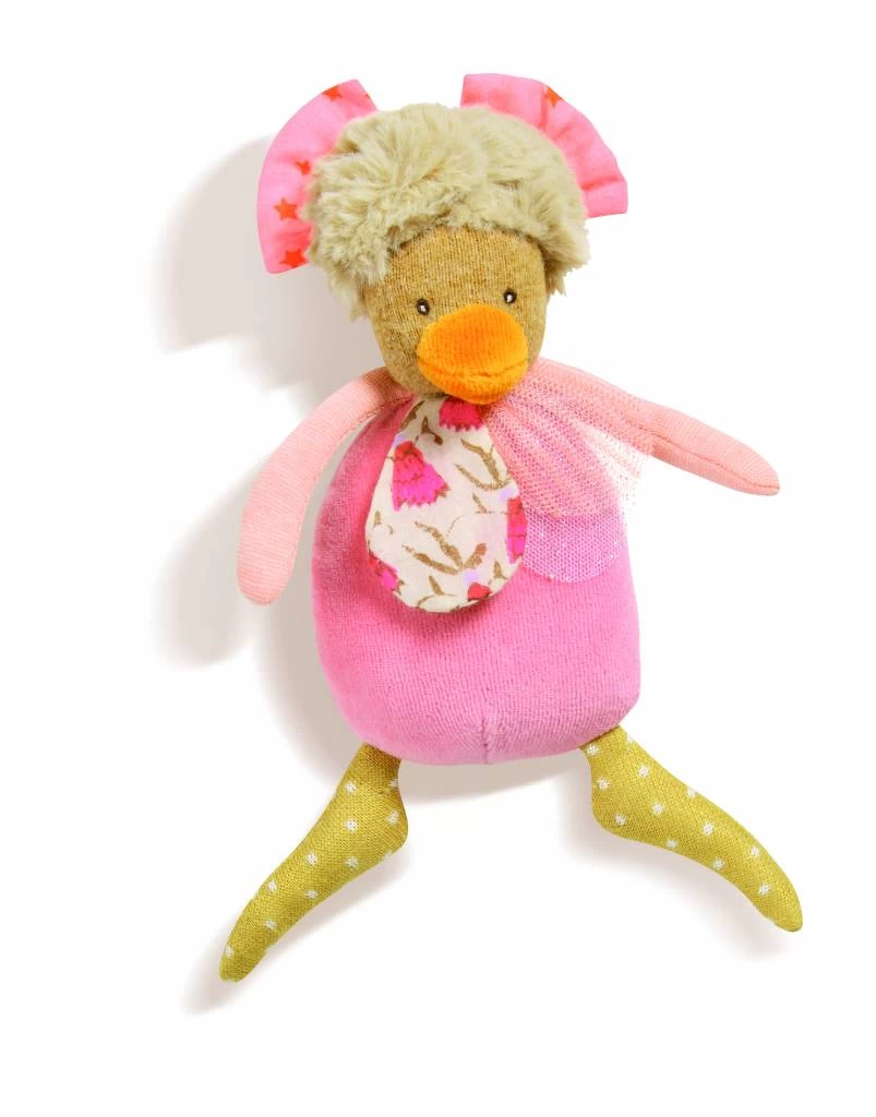 De strikjes op haar hoofd knisperen lekker als jij er in knijpt en ook de balletjes in haar buik dansen van plezier als jij met haar speelt.