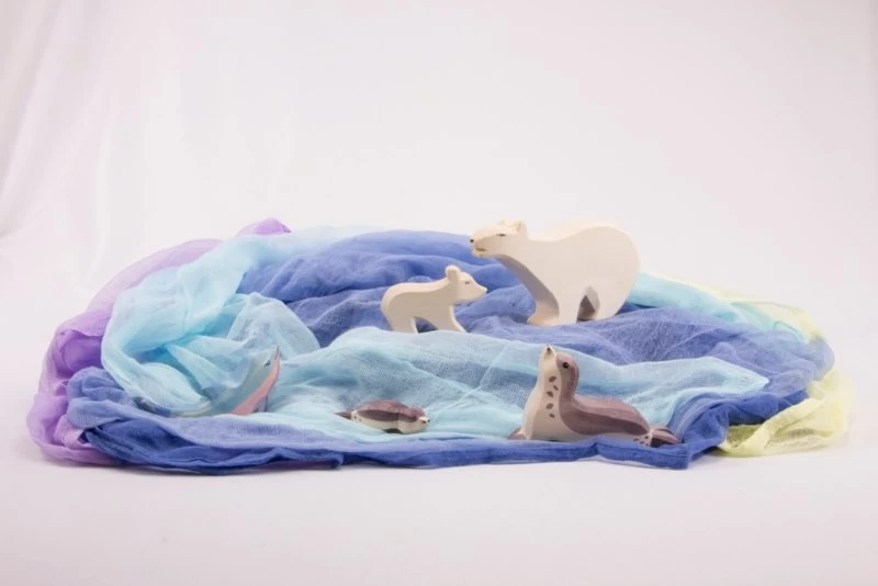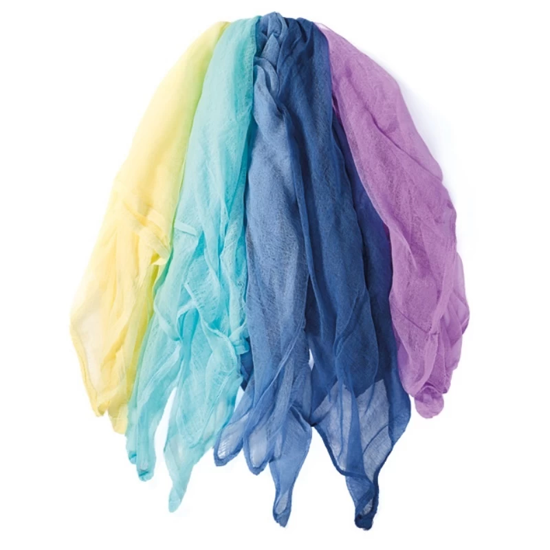 De doeken worden losjes geweven zodat ze ‘doorzichtig’ worden. Door meerdere kleuren over elkaar heen te late vallen krijg je een diepte-effect met wisselende kleuren. Hierdoor zijn de doeken uitermate geschikt voor speelse doeleinden.