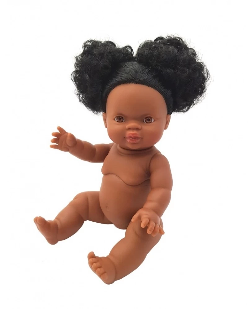Gordi meisjes babypop met donkere huid, bruine ogen en prachtige zwarte haren in twee knotjes. Een prachtige handgemaakte pop met anatomisch correct lijfje. Bijpassende kleertjes zijn te koop op de website.
