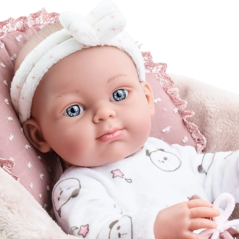 In deze heerlijke zachte roze reiswieg ligt een levensechte meisjespop van het Spaanse merk Paola Reina. Ze draagt een prachtig zacht boxpakje met pandaprint en heeft een zachte hoofdband in haar haar. De poppen van Paola Reina zijn met de hand gemaakt en dit zie je terug in de hoogwaardige afwerking.