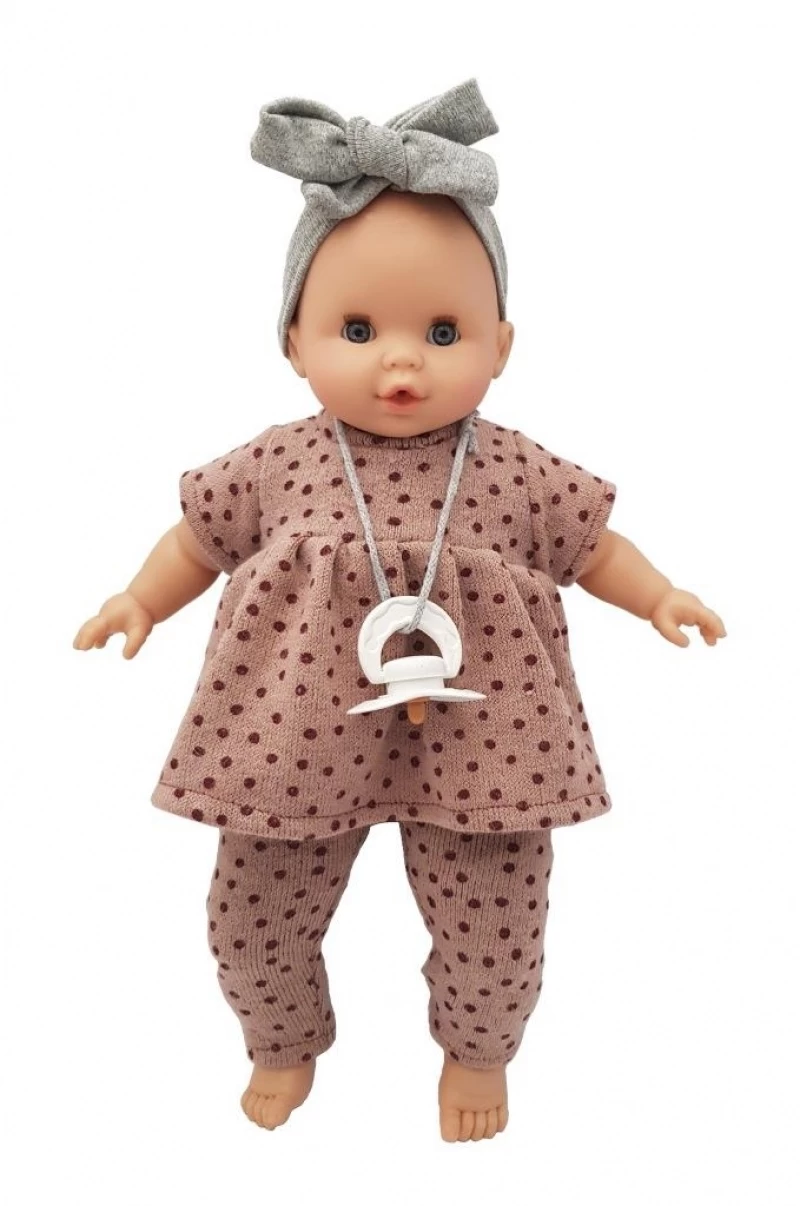 Babypop Sonia van Paola Reina is pasgeboren en kijkt vrolijk de wereld rond. Ze draagt een bruine jurk met stippen en een bijpassende legging. Op haar hoofdje een mooie grijze hoofdband met strik. Haar speentje hangt om haar nek zodat ze hem niet kwijt raakt.