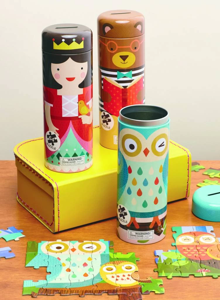 De puzzel heeft 64 stukjes en is gemaakt van gerecyclede materialen en plantaardige inkt.