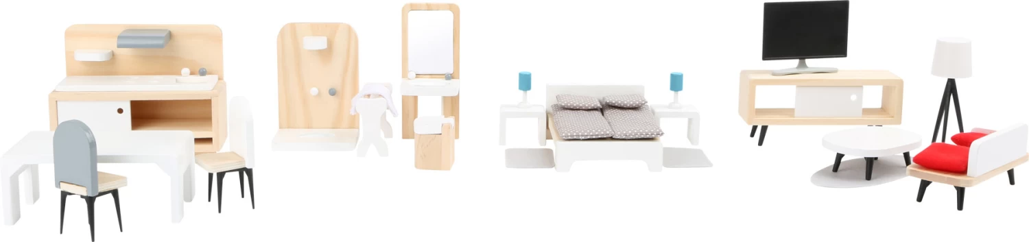 Is je poppenhuis toe aan een make-over? Deze poppenhuismeubelen in Scandinavisch design geven je huis een moderne uitstraling. De uitgebreide meubelset bestaat uit een woonkamer, een keuken, een slaapkamer en een badkamer en accessoires.