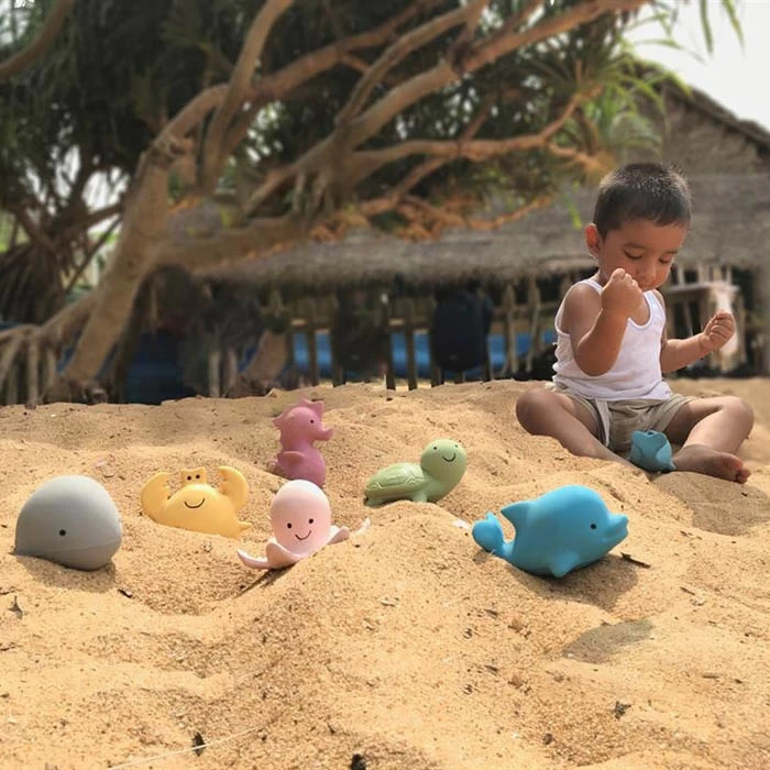 De octopus is handgemaakt van pure rubber van de Hevea boom. Hij is daardoor ecologisch en in zijn geheel biologisch afbreekbaar. Het speeltje is gekleurd met plantaardige kleurstoffen en daardoor is het natuurrubber 100% veilig om mee te spelen, op te sabbelen en te kauwen.
