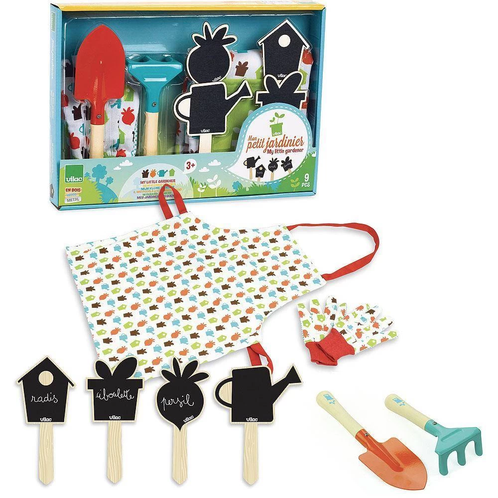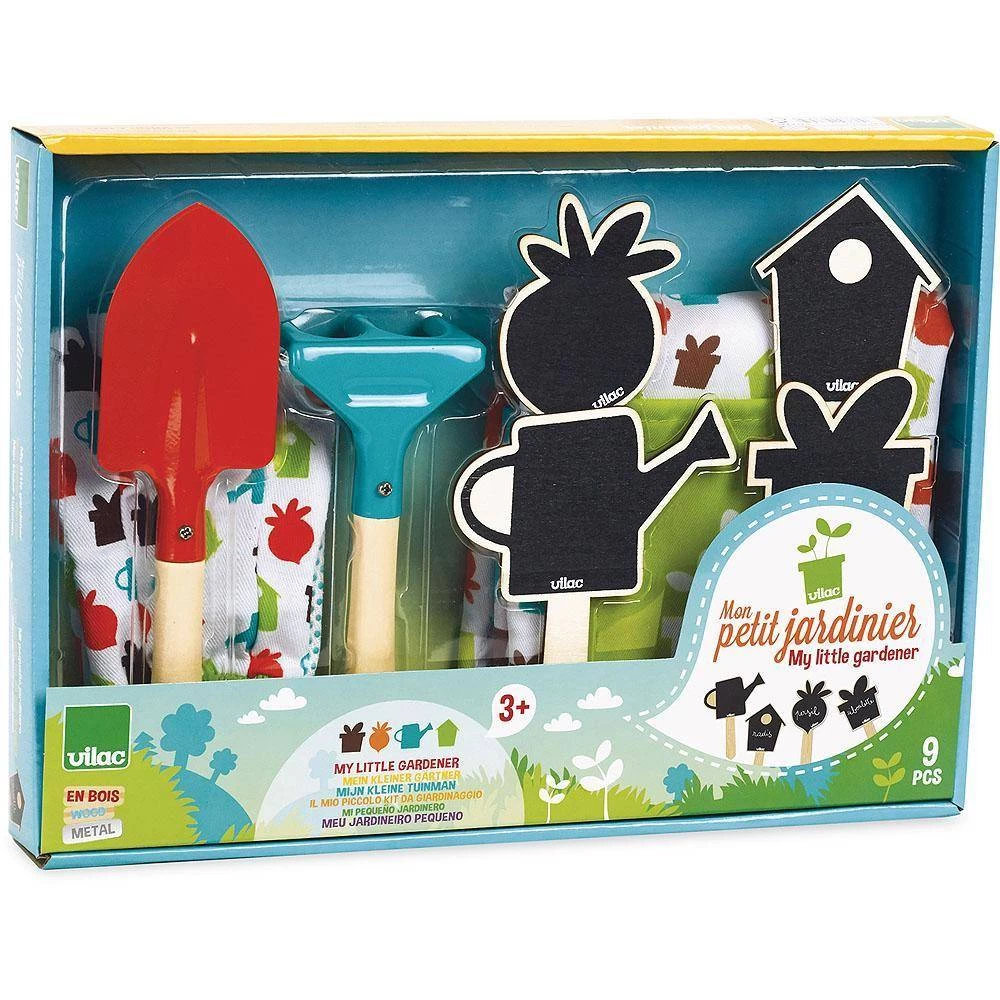 - Inhoud: een schepje, een harkje, een paar tuinhandschoenen, een tuinschort en 4 houten bordjes